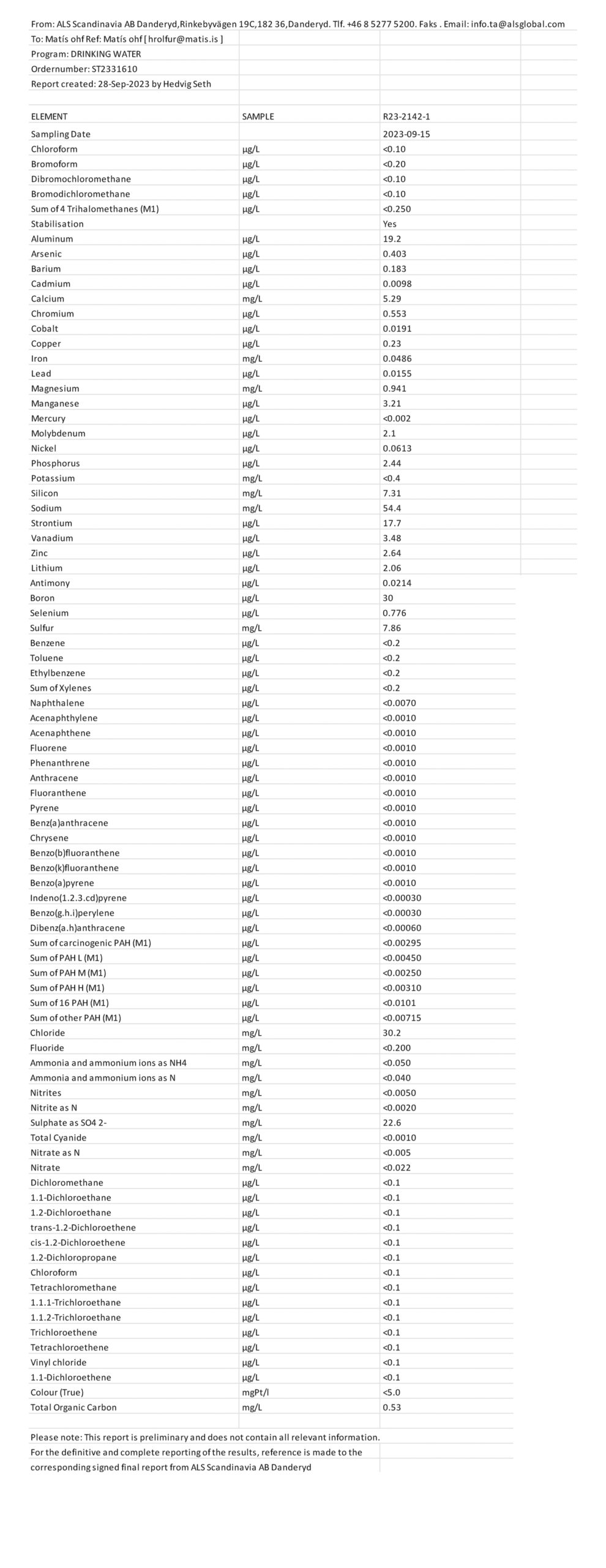 Rannsóknir hjá bæði MATÍS og ALS Global hafa sýnt að vatnið er mjög hreint og innihaldsríkt af steinefnum og með ph gildi 8,8.